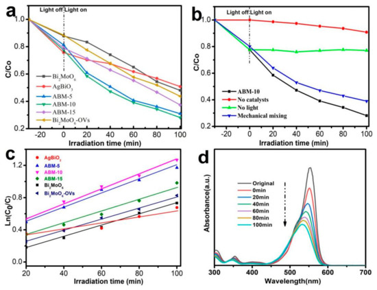 The wastewater originated from the printing and dyeing industry was not only difficult to treat but also caused serious environmental pollution that endangered human health. Among them, Rhodamine B (RhB) was the most common type, which was used as a target pollutant to evaluate the photocatalytic performance of the as-prepared samples. As shown in Figure 5a, the degradation efficiencies of pure Bi2MoO6 and AgBiO3 towards RhB were 52% and 50%, respectively, under visible-light irradiation for 100 min. The degradation efficiency of RhB by Bi2MoO6-OVs was 57%, attributed to the introduction of oxygen vacancies that could reduce the band-gap width and promote the separation and transfer of photo-generated electrons and holes, enhancing photocatalytic activity, while the photocatalytic activity of ABM-10 heterojunction was optimum with a degradation efficiency of 72%. Evidently, as the content of AgBiO3 increased, the degradation efficiency of the catalysts first increased and then decreased, indicating that AgBiO3 played an important role in the photocatalytic degradation process, which was mainly due to the fact that AgBiO3 facilitated charge transfer and suppressed the recombination of photo-induced electron and hole pairs. However, excessive AgBiO3 might form a new recombination center of photo-induced electrons and holes, reducing photocatalytic activity. As shown in Figure 5b, the control blank revealed slight degradation of RhB in absence of the catalysts and the experiments authentically reached adsorption–desorption equilibria in the dark for 30 min prior to irradiation. By comparison, the mechanical mixture of Bi2MoO6-OVs and 10 wt% AgBiO3 was also tested, and the experiments result showed that the photocatalytic activity of mechanical mixture was inferior to that of ABM-10 heterojunction, indicating the poor interfacial contact between AgBiO3 and Bi2MoO6-OVs in the mechanical mixture. In Figure 5c, the reaction kinetics of RhB degradation were modeled by pseudo-first-order kinetics model: ln (Co/C) = kt, where Co and C were, respectively, the initial and instant concentrations at reaction time t, and k was the rate constant. The rate constant of ABM-10 heterojunction was 0.0094 min−1, while the k of ABM-5, ABM-15, AgBiO3, Bi2MoO6, and Bi2MoO6-OVs were 0.0085, 0.0081, 0.0041, 0.0069, and 0.0072 min−1, respectively. The k of ABM-10 heterojunction was 1.11, 1.16, 2.29, 1.36 and 1.31 times higher than that of ABM-5, ABM-15, AgBiO3, Bi2MoO6 and Bi2MoO6-OVs. Figure 5d showed the absorbance spectrum of RhB degraded by ABM-10 heterojunction. Clearly, the characteristic peak of RhB gradually decreased at 570 nm, indicating that RhB gradually degraded.