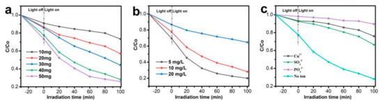 In practical applications, the content of photocatalysts was a key factor in affecting degradation efficiency. In Figure 6a, when the concentration of photocatalyst increased from 10 mg to 40 mg, the degradation efficiency of RhB was significantly improved, mainly due to the increased photocatalyst which could produce more active species. Afterwards, the effect of different concentrations of RhB on the photocatalytic degradation process was investigated in Figure 6b. It was found that, when the initial concentration of RhB increased from 5 mg/L to 20 mg/L, the degradation efficiency of RhB decreased from 80% to 35%, indicating that the photocatalytic performance of the catalysts decreased with the increase in RhB concentration. This might be attributed to the fact that the higher concentration of RhB hindered the visible-light absorption of the catalysts and consumed quickly the active species generated by the catalysts. As shown in Figure 6c, the photocatalytic performance of catalysts was explored through adding different ions (Cu2+, SO42−, PO43−, 1 mmol/L) into the degradation process of RhB. When PO43− was added into the solution, the degradation process was significantly suppressed in the presence of ABM-10 heterojunction, mainly due to the fact that PO43− easily reacted with holes, thereby reducing the photocatalytic efficiency. Subsequently, the degradation efficiency of RhB decreased with the introduction of Cu2+, which could be explained by the fact that Cu2+ could combine with RhB or intermediates to form stable metal complexes, inhibiting the degradation process [33]. In addition, the photocatalytic degradation of RhB was restrained by SO42−, which might be attributed to the fact that •OH was consumed by SO42− to generate •SO4− [34,35].