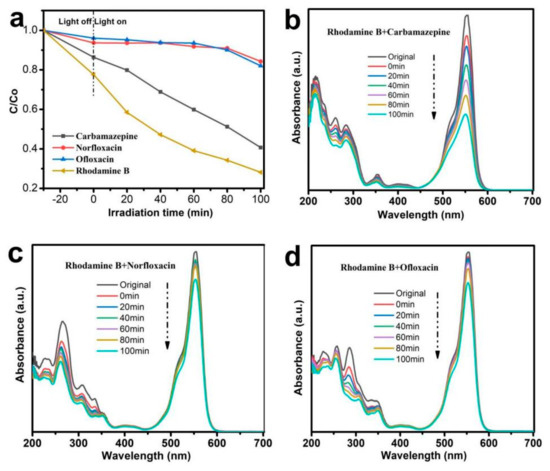 (a) Degradation efficiencies of RhB coexisting other pollutants, (b–d) Time−dependent absorption spectra of organic substances degradation.