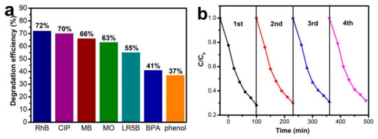 (a) Degradation efficiencies of ABM-10 towards different organic contaminants, (b) Cycle runs of ABM-10 for the degradation of RhB.