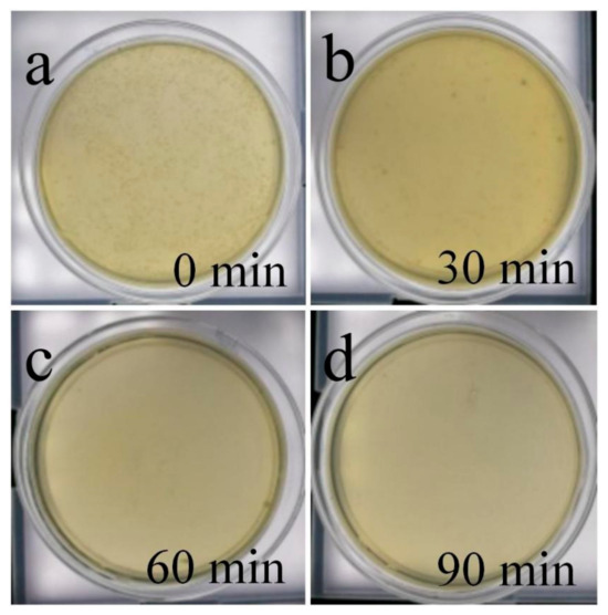 The antibacterial results of the AB-10 heterojunction were shown in Figure 9. Under dark conditions, the AB-10 heterojunction did not exhibit significant antibacterial activity (Figure 9a). Under visible-light irradiation, the ABM-10 heterojunction had a significant antibacterial effect on E. coli, completely inhibiting bacteria within 90 min (Figure 9b–d). The reason might be that the ABM-10 heterojunction generated a highly oxidizing active species under visible-light irradiation, which killed bacteria.