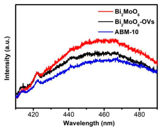 PL spectroscopy was used to investigate the recombination efficiency of photo-induced electrons and holes, and 320 nm was served as the excitation wavelength. In general, a weaker PL intensity reflects a lower recombination probability. As shown in Figure 10, the PL intensity of Bi2MoO6-OVs was lower than that of Bi2MoO6, due to the introduction of oxygen vacancies that could promote the separation and transfer of photo-induced electrons and holes. Furthermore, the PL intensity of ABM-10 heterojunction was lower than that of Bi2MoO6 and Bi2MoO6-OVs, indicating that the recombination of the photo-induced carriers of the heterojunction was effectively suppressed, which was attributed to the formation of ABM-10 heterojunction.