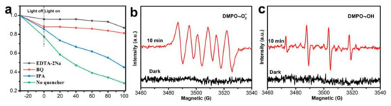 To study photocatalytic mechanism of ABM-10 heterojunction, isopropanol (IPA), disodium ethylenediaminetetraacetate (EDTA-2Na), and benzoquinone (BQ) were added to capture hydroxyl radicals (•OH), holes (h+), and superoxide radicals (•O2−), respectively [36]. The dosage of these scavengers was 2 mM. As shown in Figure 11a, after the addition of EDTA-2Na and benzoquinone in the reaction, the degradation efficiencies of RhB were only 14% and 19%, respectively, suggesting that the photodegradation process was severely inhibited. While adding IPA, the degradation efficiency of RhB was 56%, indicating that the degradation process was slightly inhibited. The results indicated that •O2− and h+ were the main active species in photocatalytic reaction, while •OH played a role in assisting degradation. Moreover, ESR experiment was carried out to detect •O2− and•OH during photocatalytic processes. As revealed in Figure 11b,c, no characteristic signal could be observed for both DMPO-•OH and DMPO-•O2− in dark. While the signals of DMPO-•OH and DMPO-•O2− were observed for ABM-10 heterojunction after 10 min, further confirming that •OH and •O2− radicals were present in the photocatalytic process.