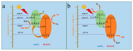 Based on the above results, a possible photocatalytic mechanism of ABM-10 heterojunction could be supposed (Figure 12). As shown in Figure 12a, AgBiO3 and Bi2MoO6 generated photo-induced electron-hole pairs on the surface under visible-light irradiation. Traditionally, the photo-generated electrons of AgBiO3 would transfer to the CB of Bi2MoO6. Meanwhile, the photo-generated holes of Bi2MoO6 would transfer to the VB of AgBiO3 [24]. However, the CB position of Bi2MoO6 (−0.21 eV) was more positive than the standard redox potential of E (O2/•O2−) (−0.33 eV vs. NHE) [37], which resulted in the photo-induced electrons in the CB of Bi2MoO6 not reacting with O2 to produce •O2−, which is inconsistent with the capture experiment. Evidently, the trapping experiment and ESR analysis have demonstrated that •O2−, h+ and •OH were present in the degradation process. Accordingly, the Z-scheme charge transfer mechanism was supposed. In Figure 12b, the CB position of AgBiO3 (−0.68 eV) was more negative than the standard redox potential of E (O2/•O2−) (−0.33 eV vs. NHE), which led to the photo-induced electrons on the conduction band of AgBiO3 to reduce O2 to •O2−. In addition, the VB position of Bi2MoO6 (+2.57 eV) was more positive than the standard redox potential of E (•OH/OH−) (+1.99 eV vs. NHE) [38,39], which meant that H2O could be oxidized to generate •OH. Therefore, the Z-scheme charge transfer mechanism was more reasonable for the RhB degradation process.