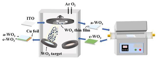 Indium tin oxide (ITO)-coated glass substrates (1.0 × 2.0 cm2, sheet resistance: 7–10 Ω/sq) underwent sequential ultrasonic cleaning in acetone, anhydrous ethanol, and deionized water for 10 min per solvent. Residual contaminants were removed via high-purity nitrogen blow-drying under laminar flow conditions. Amorphous WO3 (a-WO3) layers were deposited using a QMS-450 RF magnetron sputtering system (Weikemu General Instruments Co., Shenyang, China) equipped with a 50 mm diameter × 5 mm thickness WO3 target (99.99% purity). The magnetron sputtering process was conducted under ambient temperature conditions, utilizing a sputtering power of 100 W (corresponding to a power density of 4.0 W/cm2). The deposition was carried out in a controlled Ar/O2 atmosphere with a gas flow ratio of 90:10, while maintaining a constant chamber pressure of 1.4 Pa throughout the process.