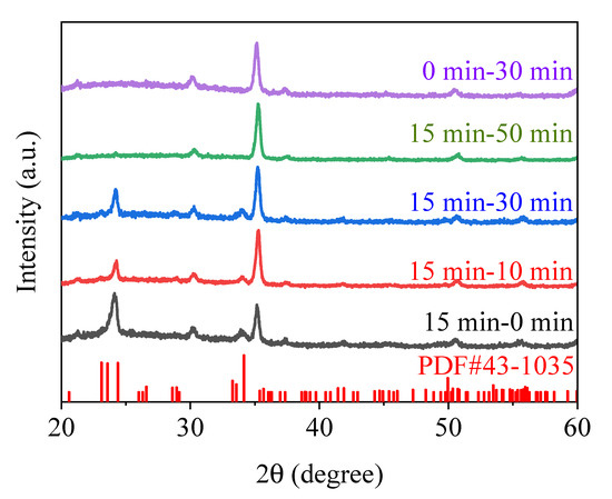 The crystal structure of the thin was characterized by XRD (Rigaku D/max-2500V/PC X-ray diffractometer, Tokyo, Japan). The surface morphology and cross-sectional features of the films were examined by a JSM-7610F scanning electron microscope (SEM, JEOL Ltd., Tokyo, Japan). Optical properties were measured by a UV-2600 UV-visible spectrophotometer (Shimadzu Corpo-ration, Kyoto, Japan). The electrochemical properties of the electrochromic thin films were evaluated using a CHI760E electrochemical workstation (Shanghai Chenhua Instrument Co., Ltd., Shanghai China), which employs a conventional three-electrode system: a platinum foil as the counter electrode, Ag/AgCl as the reference electrode, and the prepared film as the working electrode. The electrolyte was 1 mol/L lithium perchlorate dissolved in propylene carbonate (LiClO4/PC, Kolod New Energy Technology Co., Ltd., Dongguan, China). Cyclic voltammetry (CV) was performed using an electrochemical workstation and a conventional three-electrode configuration, and the cyclic voltammetry curves were tested for different cycling rates (0.01 V/s~0.10 V/s) in the range of −1 V~+1 V. The cyclic stability of the films was tested using the chronoamperometry (CA) method, with the test voltage of ±1 V and the pulse width of 20 s. The cyclic voltammetry profiles before and after cycling were finally compared with those before and after the sweeping rate of 0.05 V/s cyclic voltammetry before and after cycling. As for testing the transmittance under coloring and fading condition, this was performed by the amperage-time curve (i-t) method by applying a constant voltage (−0.8 V~−1.4 V) for about 5 min, so that it was fully colored and then the transmittance of the films at 300~800 nm was tested by UV spectrophotometer.