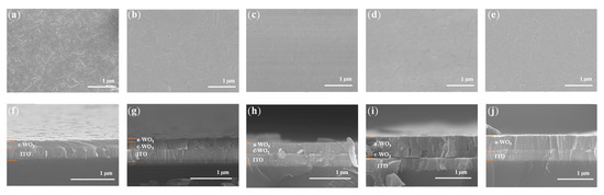 The surface and cross section morphology of WO3 thin films were characterized by scanning electron microscopy (SEM), as shown in Figure 3a–j. Figure 3a–e is the SEM image of the surface, and there are no obvious voids on other surfaces except Figure 3a (15 min–0 min), where there are more voids. Figure 3f–j is a cross-section image, where each double-layer structure is clearly visible and the thickness of the crystal base (c-WO3) is 115 nm. The thickness of the amorphous top layer (a-WO3) was 73 nm (15 min–10 min), 148 nm (15 min–30 min), and 322 nm (15 min–50 min), respectively. The thickness of the independent a-WO3 film (0 min–30 min) is 262 nm. It is noteworthy that surface roughness systematically decreases with increasing a-WO3 thickness, indicating a smoothing effect during sequential deposition [23]. This morphological evolution is attributed to the filling of the surface void during the secondary sputtering process.
