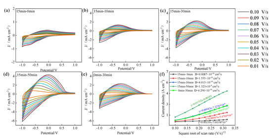 Cyclic voltammetry (CV) curves of WO3 films at different scan rates: (a) 15 min–0 min, (b) 15 min–10 min, (c) 15 min–30 min, (d) 15 min–50 min, and (e) 0 min–30 min and (f) the relationship between the peak cathodic current and the square root of the scan rate.