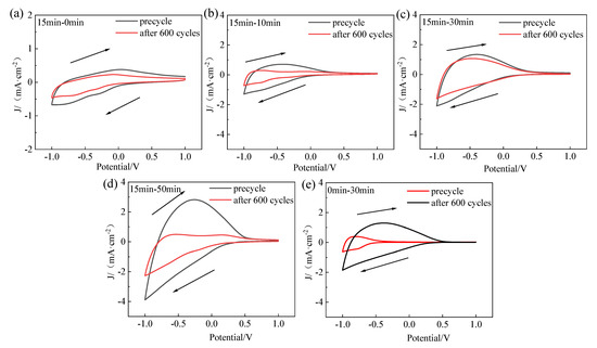 where Ip is the peak current (A), A is the electrode area (cm2), C0 is the electrolyte concentration (mol/mL), n is the number of electrons transferred (n = 1 for Li+), and v is the scan rate (V/s). The derived D0 values span from 0.0087 × 10−10 cm2/s (15 min–0 min) to 4.290 ×10−10 cm2/s (0 min–30 min), demonstrating a strong correlation with a-WO3 thickness (Figure 4f). This trend underscores the superior ionic conductivity of the amorphous phase compared to its crystalline counterpart, consistent with the open network structure of a-WO3 facilitating rapid ion transport [26]. The long-term durability of the films was evaluated by comparing initial and post-cycling CV profiles after 600 cycles at 0.05 V/s (Figure 5a–e). The bilayer films (15 min–0 min, 15 min–10 min, 15 min–30 min) exhibit exceptional stability, attributed to the structural reinforcement provided by the crystalline base layer. In contrast, the standalone a-WO3 film (0 min–30 min) suffers from severe degradation, likely due to irreversible phase segregation and oxygen vacancy depletion during prolonged cycling [27]. These results highlight the critical role of phase-boundary engineering in balancing dynamic performance and structural integrity.