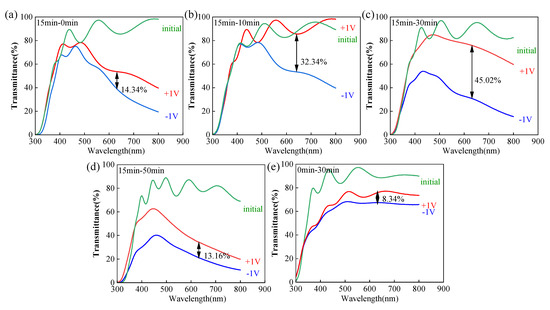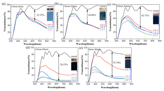 Transmittance spectra of WO3 films under different coloring voltages and at −1 V after coloring, with corresponding photographs: (a) 15 min–0 min, (b) 15 min–10 min, (c) 15 min–30 min, (d) 15 min–50 min, and (e) 0 min–30 min.