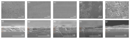 SEM images of WO3 film surface after 600 electrochemical cycles: (a) 15 min–0 min, (b) 15 min–10 min, (c) 15 min–30 min, (d) 15 min–50 min, (e) 0 min–30 min; SEM images of cross–section (f) 15 min–0 min, (g) 15 min–10 min, (h) 15 min–30 min, (i) 15 min–50 min, (j) 0 min–30 min.