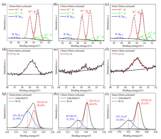 XPS spectra of (a–c) W 4f, (d–f) Li 1s, and (g–i) O 1s in the colored states of 15 min–0 min, 15 min–30 min, and 0 min–30 min.