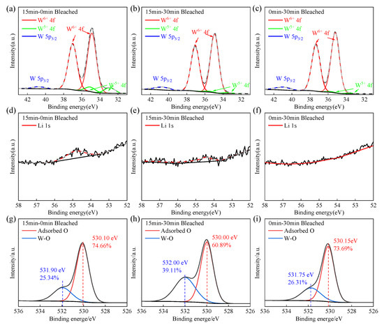XPS spectra of (a–c) W 4f, (d–f) Li 1s, and (g–i) O 1s in the discoloration states of 15 min–0 min, 15 min–30 min, and 0 min–30 min.