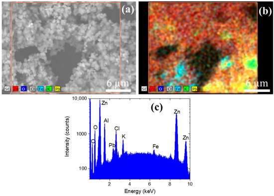 The elemental distribution maps and energy-dispersive X-ray spectroscopy analysis of the WON powder are presented in Figure 2. This analysis shows that the sample is fundamentally composed of Zn. Despite that, some impurities distributed throughout the sample were also found. Cl, Pb, and Fe were detected as principal impurities, in good agreement with the obtained results from the AAS measurements. As can be appreciated, the impurities are located and concentrated in particle agglomerates, probably between ZnO particles.