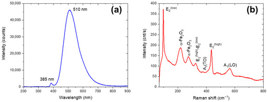 The spectrum registered by micro-Raman spectroscopy (Figure 3b) exhibits several bands attributable to the ZnO [10]. The zero-order optical phonons in the ZnO wurtzite structure are given by Γopt = A1 + 2B1 + E1 + 2E2 [10]. The A1 and E1 modes are polar and split into a transverse optical mode (TO) and a longitudinal optical mode (LO). The E2 mode consists of low E2(low) and high E2(high) frequency phonon modes, where E2(high) is associated with the vibration of oxygen atoms, and E2(low) is related to heavy Zn sublattices. On the other hand, the B1 modes are not Raman active [10]. Then, in the Raman spectrum, the ZnO vibrations identified display sharp peaks at 97 and 435 cm−1 related to E2(low) and E2(high), respectively; the E2(high)–E2(low) mode at 324 cm−1 (with A1 symmetry); the A1(TO) mode at 375 cm−1; and the A1(LO) mode at 574 cm−1.