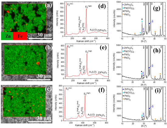 Elemental distribution maps plotted using Zn-Kα and Fe-Kα were obtained for each sample (see Figure 5a–c), which reveal areas with a non-homogeneous distribution of Fe. No additional impurities were detected within the sensitivity of the measurements. The Raman spectra for the three samples (Figure 5d–f) revealed the presence of ZnO-related modes (same as those described before; the origin is again indicated in the figure), whereas the modes associated with α-Fe2O3 disappeared. Additionally, a band centered at 650 cm−1 can be attributed to the ZnFe2O4 phase [13,14]. Finally, XRD measurements (Figure 5g–i) confirmed the disappearance of most of the XRD reflections related to lead oxides, lead chlorides, and iron chlorides, whereas the maxima associated with the ZnFe2O4 phase were still present.