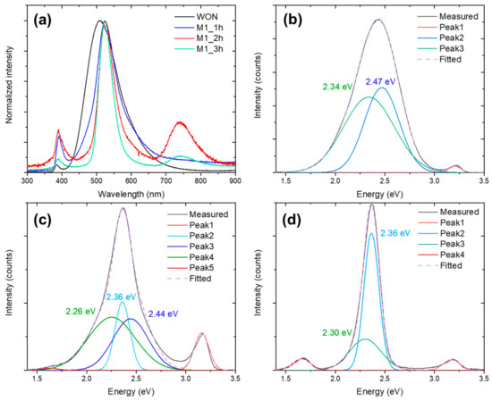 (a) Comparative spectra for the WON sample and the samples obtained at different reaction times; deconvoluted CL spectra for the initial WON (b), M1_1h (c), and M1_3h samples (d).