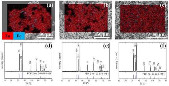 Compositional mappings of Zn-Kα (red) and Fe-Kα (blue) for samples (a) M2, (b) M4, and (c) M6. Diffractograms for samples (d) M2, (e) M4, and (f) M6.