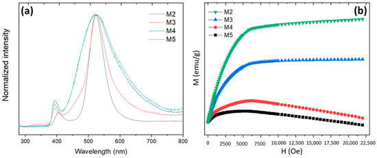 Magnetic measurements were registered using a PPMS-14 T (Physical Property Measurement System) (Quantum Design, San Diego, CA, USA) at room temperature. Magnetization as a function of the applied magnetic field was determined using vibrating sample magnetometry (VSM).