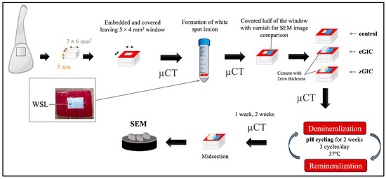 In this study, a demineralization solution was used to develop artificial WSLs. Our preliminary investigation found that a lesion with no depth and softened enamel could be induced through a chemical method following four days of immersion in a demineralization solution (DS) (1.5 mM CaCl2, 0.9 mM KH2PO4, and 50 mM acetic acid, adjusted to pH 5.0 with 10 M KOH). Every specimen was submerged separately in 10 mL of the demineralizing solution at 37 °C, with 100 revolutions per minute. The demineralization solution was replenished with a fresh batch every 24 h to control pH fluctuations. After 4 days, all the specimens were retrieved, cleaned with deionized water, and analyzed for WSL formation using a mirrorless digital camera (X-S10, Fujifilm, Tokyo, Japan) and µCT.