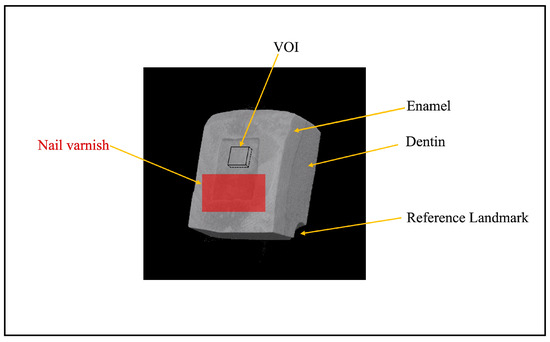 A typical three-dimensional (3D) micro-focus X-ray computed tomography (μCT) image of enamel–dentin block after demineralization, with a reference landmark in the corner. VOI: volume of interest (200 × 200 × 15 μm3).