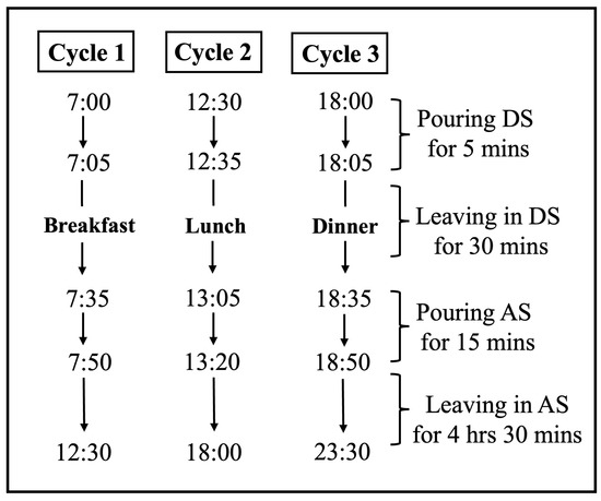 After the application, each group was immersed separately in artificial saliva (AS) (130 mM KCl, 1.5 mM CaCl2, 0.9 mM KH2PO4, and 20 mM HEPES, adjusted to pH 7.0 with 10 M KOH) [24] and DS, taking turns using an automatic pH cycling system [25]. The pH cycle was set as three cycles per day (Figure 3), simulating the normal meal cycle of a human. The pH cycle started at 7:00 A.M and ended at 11:30 P.M. The specimens were left in the AS from 11:30 P.M to 7:00 A.M the next morning. Therefore, the specimens were immersed for a total of 1.5 h in DS and 22.5 h in AS each day.