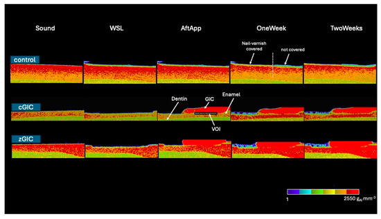 MD value comparisons between the control, cGIC, and zGIC groups, considering up to 15 μm of depth from the lesion surface, are summarized in Table 2 in chronological order. The MD values in the zGIC group were significantly higher than those in both the control and cGIC groups after application, as well as at 1 week and 2 weeks of pH cycling, while the cGIC group also showed significantly higher MD values than the control group during the same periods. The zGIC group showed the highest degree of remineralization among all three groups.