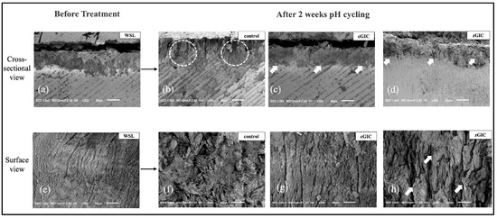 SEM images of enamel: cross-sectional and surface views of WSLs after 2 weeks of pH cycling at 300 magnifications. (a) Cross-sectional SEM images after 4 days of demineralization. (b) Image of control group after 2 weeks of pH cycling. White circles indicate the remineralized enamel structure after 2 weeks of pH cycling. (c) Cross-sectional image of cGIC group 2 weeks after treatment. (d) Cross-sectional image of zGIC group 2 weeks after treatment. White arrows indicate the degree of new mineral gain from the GIC. (e) Surface-view images after 4 days of demineralization. (f) Images of control group after 2 weeks of pH cycling. (g) Images of cGIC group after 2 weeks of treatment. (h) Images of zGIC group after 2 weeks of treatment. White arrows indicate the enamel crystal protrusions from remineralization.