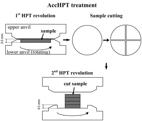 The samples for the conventional HPT (hereinafter HPT) and accumulative HPT (hereafter AccHPT) (10 mm in diam. and approximately 1.5 mm thick) were cut using the electrical discharge machining. The HPT and AccHPT were carried out on a 10 mm diam. anvil with a 0.5 mm deep groove at room temperature and 6 GPa pressure. The detailed methodology of AccHPT was described in [11] and schematic representation is presented in Figure 1. The total revolution number for HPT was n = 1, n = 5, and n = 10; for AccHPT n = 10, but after n = 1, n = 2 and n = 3, the samples were cut into 4 equal segments, which were subsequently stacked on top of each other in the anvil, and then the HPT-treated with n = 7 revolutions obtained a monolithic disk. Thus, the AccHPT sample was also subjected to large compressive strain, and the total accumulated strain in AccHPT was significantly higher than after HPT. The samples after AccHPT were subjected to PDA at 500 or 600 °C for 15 min. The choice of these regimes was aimed at creating a two-phase state due to the reverse martensitic transformation (ε → γ) followed by partial martensitic γ → ε transformation upon cooling without strong softening.