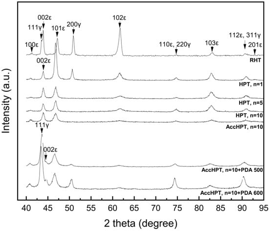 In summary, it can be concluded that the HPT (except HPT, n = 1) and AccHPT, n = 10 produce a single phase state of deformed cooling-induced ε-martensite and stress-induced ε-martensite. Also, AccHPT with subsequent PDA at 500 and 600 C produces the two-phase state of γ-austenite and cooling-induced ε-martensite. These trends correlate well with the results of the TEM microstructure studies. We should bear in mind that the presence of only one overlapping-free {200}γ austenite line does not allow for an accurate quantitative analysis of the two-phase state of the alloy.