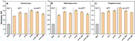 Hardness values obtained in the central zone (a), half-radius zone (b) and peripheral zone (c) of the Fe-30Mn-5Si alloy after RHT, HPT, AccHPT and AccHPT with subsequent PDA.