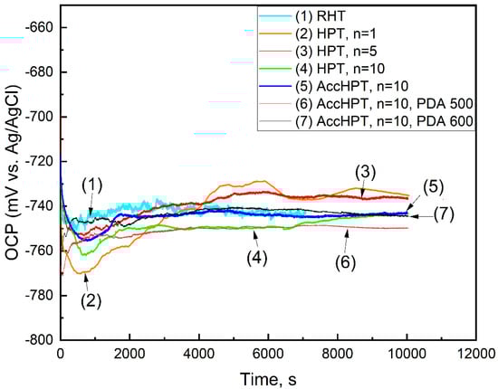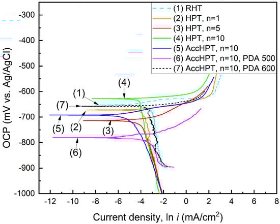 The steady-state OCP values of the samples after HPT for n = 1 and n = 5 are higher compared to those of RHT, indicating the decrease in corrosion activity, which can be explained by the single-phase state of stress-induced ε-martensite formed after these treatments. It is noteworthy that in Fe-30Mn-5Si alloy the γ-austenite acts as the cathodic structural component, while ε-martensite is the anodic one. The small amount or the absence of γ-austenite leads to cathodic process overvoltage, limiting the overall corrosion (biodegradation) rate and resulting in a more positive OCP value. The OCP values of the samples after HPT, n = 10 and AccHPT, n = 10 are in the same region as those for RHT. This behavior can be attributed to the presence of a mixture of SMCS and NCS in both HPT, n = 10 and AccHPT, n = 10 (see Figure 3). It is well known that the development of crystal lattice defects (grain/subgrain boundaries and dislocation density) leads to a negative shift in the OCP values [22,23]. In this regard, the presence of a mixture of SMCS and NCS after the HPT and AccHPT, n = 10 compensates for the absence of the cathodic structural component (γ-austenite) and results in similar OCP values. The PDA at 500 and 600 °C after AccHPT, n = 10 results in a slight shift in the OCP values towards the negative values presumably due to with the two-phase state structure within the predominant SMCS.