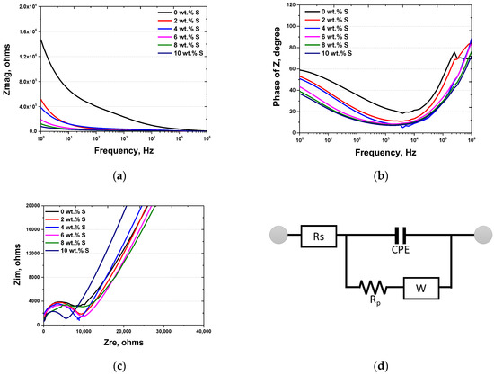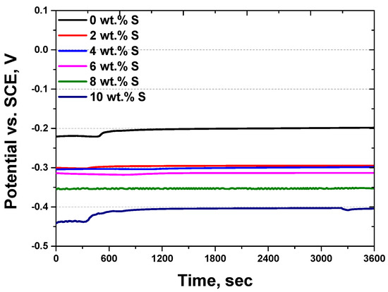 - Electrochemical tests demonstrated that the addition of sulfur lowered the open circuit potential and reduced passive layer resistance, indicating an increased corrosion susceptibility to corrosion. While a moderate sulfur content (from 0 to 4 wt.%) maintained a relatively stable electrochemical response, higher sulfur levels significantly (to 6 wt.%) weakened the passive layer and increased the corrosion rates. The EIS results supported that the sulfur-rich cement exhibited a decrease in resistance, suggesting the degradation of the surface oxide layer, which is crucial for corrosion protection.