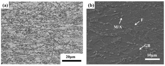 The materials used were X80 pipeline steel produced by Shengli Xianggang Steel Pipe Co., Ltd., (Xiangtan, Hunan, China) for the Sichuan-to-East Gas Transmission Project. The size of the sheet was 300 mm × 150 mm × 22 mm, produced by the Thermo Mechanical Control Process (TMCP), which is a highly optimized process that combines controlled rolling at 950 °C and accelerated cooling at a rate of up to 30 °C/s to achieve a fine-grained, high-strength microstructure; Figure 1 shows the microstructure. It was found that the materials consist of polygonal ferrite (F), granular bainite (GB) and a small amount of martensite/residual austenite (M/A). This microstructure provides excellent strength, toughness, and weldability, making X80 steel ideal for pipeline applications. The grain deformation along the rolling direction can also be observed. The welding protective gas introduced was 100% Ar.