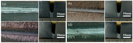 Weld profiles and cross-section morphologies of joint with specified linear energy. (a) 210 J/mm; (b) 162 J/mm; (c) 180 J/mm; (d) 270 J/mm.