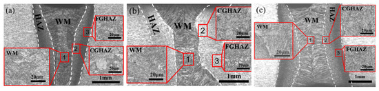 A cross-section of the metallographic microstructure of the joint with different linear energy. (a) 180 J/mm; (b) 210 J/mm; (c) 270 J/mm.