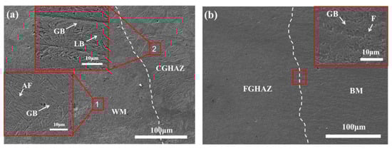 Microstructures of different micro-zones in welded joints characterized by SEM: (a) near the fusion line; (b) near the boundary between HAZ and BM.