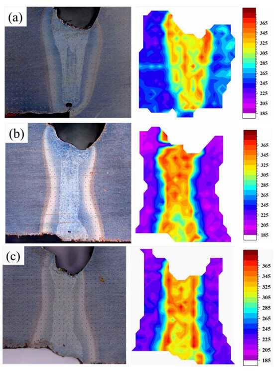 Microhardness nephogram of laser-welded X80 joint with different heat inputs. (a) 180 J/mm; (b) 210 J/mm; (c) 270 J/mm.