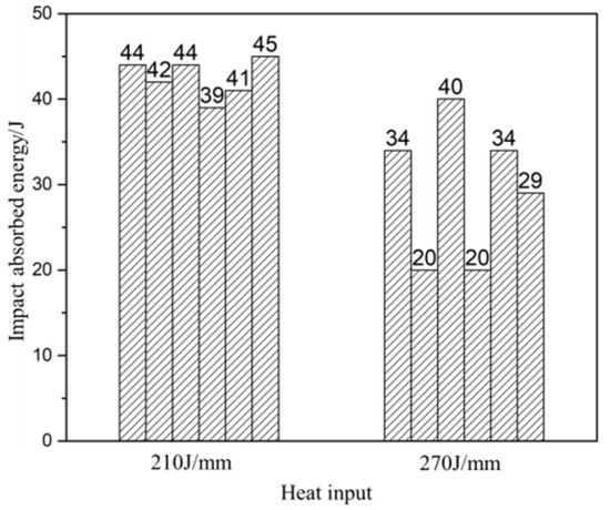 When the heat input is lower than 180 J/mm, the penetration effect of a 6 mm root face is insufficient. Therefore, the impact toughness of the WM under 210 J/mm and 270 J/mm at −10 °C were tested in this work. The results show that the impact toughness of the WM is high and stable under the condition of lower heat input, as shown in Figure 8. The content of Nb in X80 steel used here was low, which decreased the inhibiting effect of grain growth. This fact was also not conducive to obtaining good toughness under the conditions of a large heat input and cooling rate. That is, the toughness of the WM was sensitive to the variations in heat input [21,22].