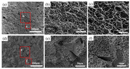 The SEM impact fracture morphologies of X80 steel when laser welding with two different heat inputs was used are presented in Figure 8. It can be seen that the microscopic fracture morphology exhibits a slight difference under the two heat inputs. When the heat input is 210 J/mm, the fracture of the specimen displays a large amount of continuously distributed cup-shaped dimples, and the dimples are relatively deep, which is an obvious toughness fracture. The specimen tested at 270 J/mm (Figure 9b) displays smaller and shallower dimples compared to specimens at the lower heat input. The fracture shows a characteristic of a pore-aggregated fracture, coupled with discontinuously distributed cleavage planes. Localized microcracks can also be observed. The degradation in toughness at a higher heat input (270 J/mm) is attributed to austenite grain coarsening and the precipitation of coarser carbide at the boundaries, resulting in a decrease in the number of grain boundaries and more brittle phases along the grain boundaries. The sliding capacity of the grain boundary was therefore suppressed, which resulted in a decrease in toughness. Therefore, the lower heat input would be conducive to obtaining a suitable impact toughness in the WM.