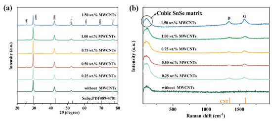 Figure 2a displays the XRD pattern of the prepared MWCNTs/Sn0.50Ag0.25Bi0.25Se0.50Te0.50 composites. All observed Bragg peaks of the synthesized polycrystalline Sn0.50Ag0.25Bi0.25Se0.50Te0.50 can be indexed as cubic-phase SnSe polycrystalline (Fm-3m space group, PDF#89-4781), confirming the successful synthesis of Sn0.50Ag0.25Bi0.25Se0.50Te0.50 polycrystalline [24,25,26,33,36]. With the introduction of MWCNTs, the position and half-peak width of all diffraction peaks in the prepared MWCNTs/Sn0.50Ag0.25Bi0.25Se0.50Te0.50 composites are almost unchanged. This phenomenon shows that the prepared Sn0.50Ag0.25Bi0.25Se0.50Te0.50 polycrystalline does not undergo reaction and degradation through the composite process. Owing to the low diffraction peak intensity and content of the introduced MWCNTs, no obvious diffraction peak of MWCNTs was observed in the prepared composites. To confirm the presence of MWCNTs in the prepared composites, Raman spectroscopy was performed, as shown in Figure 2b. It is obvious that two distinct characteristic peaks at approximately ~1350 cm⁻1 and ~1590 cm⁻1 appeared with the introduction of MWCNTs, which corresponded to the D band and G [37] band of MWCNTs, respectively [36]. With the increase in MWCNT content, the intensities of both D and G bands gradually enhanced, which indicates that MWCNTs have been successfully introduced into the prepared composites.