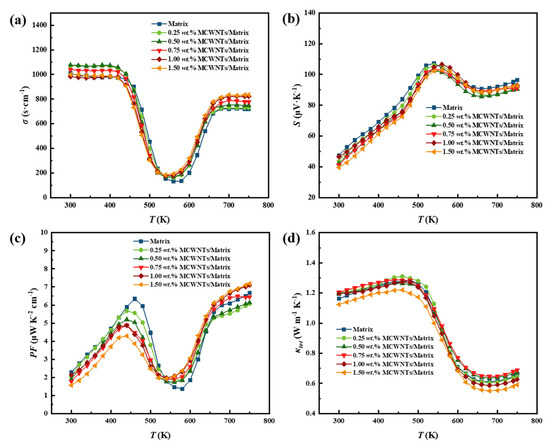 Figure 5a shows the temperature-dependent electrical conductivity curves of the prepared MWCNTs/Sn0.50Ag0.25Bi0.25Se0.50Te0.50 composites. As MWCNTs were being introduced into Sn0.50Ag0.25Bi0.25Se0.50Te0.50 matrix, the temperature-dependent trend of electrical conductivity remained consistent with that of the pristine Sn0.50Ag0.25Bi0.25Se0.50Te0.50. The electrical conductivity of the prepared bulk composites increased dramatically at room temperature with the introduction of MWCNTs, which was attributed to the significantly increased carrier concentration (Table 1). The introduced MWCNTs can form a channel inside the prepared MWCNTs/Sn0.50Ag0.25Bi0.25Se0.50Te0.5 composites, owing to their tubular nanostructure with high length-to-diameter ratio. Moreover, MWCNTs possess π-type electron clouds formed by sp2 hybridization, which exhibit near-metallic properties (i.e., high electrical conductivity). Therefore, the MWCNTs dispersed within the matrix probably form a “high-speed channel” for carrier transport [37,41,42,43,44], significantly enhancing carrier concentration while maintaining high carrier mobility, as illustrated in Figure 6. However, at higher MWCNT concentrations, a reduction in electrical conductivity was observed in the prepared composites owing to the decreased effective carrier concentration (Table 1). This decrease in carrier concentration was possibly attributed to the enhanced carrier scattering with the increased composite interfaces [37] or some agglomeration of the nanotubes in the prepared composites [42,43,44]. The electrical conductivity of all MWCNTs/Sn0.50Ag0.25Bi0.25Se0.50Te0.5 composites decreased with the increasing temperature below 550 K, showing metal-like behavior. When the temperature exceeded this point, their electrical conductivities increased sharply, which was probably attributed to the thermal excitation of a few carriers (bipolar diffusion phenomenon) [33,34].