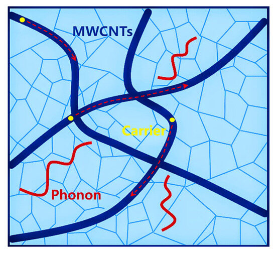 Schematic diagram of carrier transport high-speed pathways and phonon scattering formed by MWCNTs in the matrix.