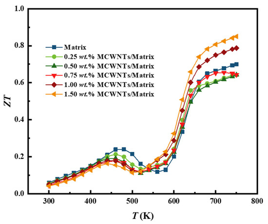 Temperature-dependent ZT curve of the prepared MWCNTs/Sn0.50Ag0.25Bi0.25Se0.50Te0.50 composites with various MWCNT contents.