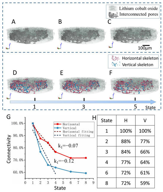 To further illustrate the directional evolution features, we enlarged a local area of interconnected pores. From Figure 4A, a specific region was selected and magnified, and Figure 4B–F show the evolution images of this area. Figure 4B represents the initial state of this region, where light-colored parts depict lithium cobalt oxide electrode material and green parts indicate interconnected pores. Red dashed lines and black dashed lines, respectively, mark a pair of interconnected pore regions with similar morphology and volume in the horizontal and vertical orientations. As sintering progressed, the pore volume in Figure 4C gradually reduced in this area. In Figure 4D,E, regions with smaller pore volume in the vertical direction began to disappear, resulting in a decrease in vertical connectivity. Figure 4F shows the final state of this region, where the volume of vertically interconnected pores has significantly decreased compared to the initial state, leading to a rapid decline in vertical connectivity, while the volume of horizontally interconnected pores has only slightly reduced. Observing the evolution of this local area reveals that vertical pores disappear more during the evolution process, while horizontal pores maintain their overall structure, thus preserving better horizontal connectivity.