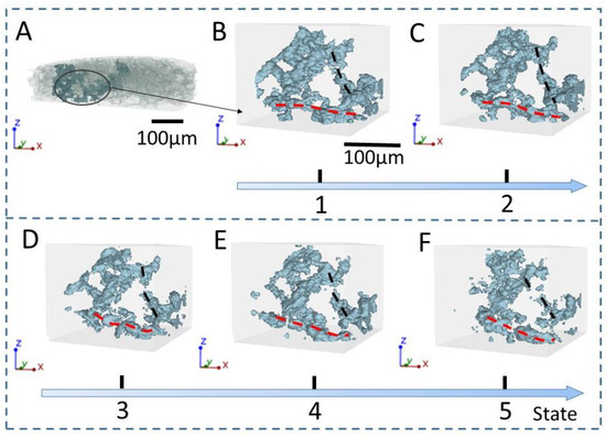 Local connectivity pore evolution image. (A) Local pore magnification image; (B) 3D image of State 1; (C) 3D image of State 2; (D) 3D image of State 3; (E) 3D image of State 4; (F) 3D image of State 5.