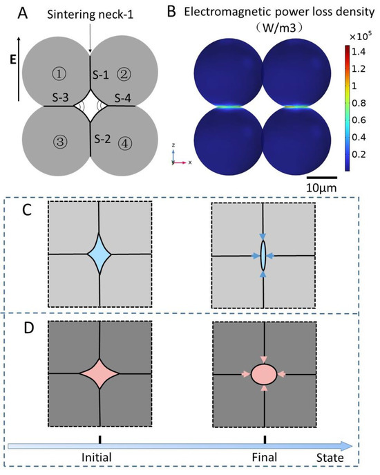 The growth of sintering necks depends on the interaction between the microwave field and the particles [28,29]. To study the evolution mechanism, we established a particle–electric field model and employed numerical simulation methods [30]. Figure 5A illustrates the particle–electric field model, where four lithium cobalt oxide particles are initially placed. Sintering necks (S-1, S-2, S-3, S-4) between the particles were labeled: S-1 and S-2 were parallel to the vertical electric field direction, while S-3 and S-4 were perpendicular.