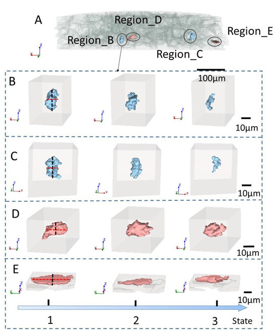 Local evolution image of isolated pores: (A) local pore magnification image; (B) 3D evolution diagram of horizontal pore 1; (C) 3D evolution diagram of horizontal pore 2; (D) 3D evolution diagram of vertical pore 1; (E) 3D evolution diagram of vertical pore 2.