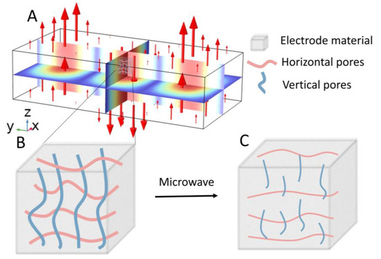 A potential method for fabricating electrodes with directional pores for both high density and high ion transport efficiency: (A) electromagnetic field distribution diagram of the microwave cavity; (B) schematic diagram of pores before sintering; (C) schematic diagram of pores after sintering.