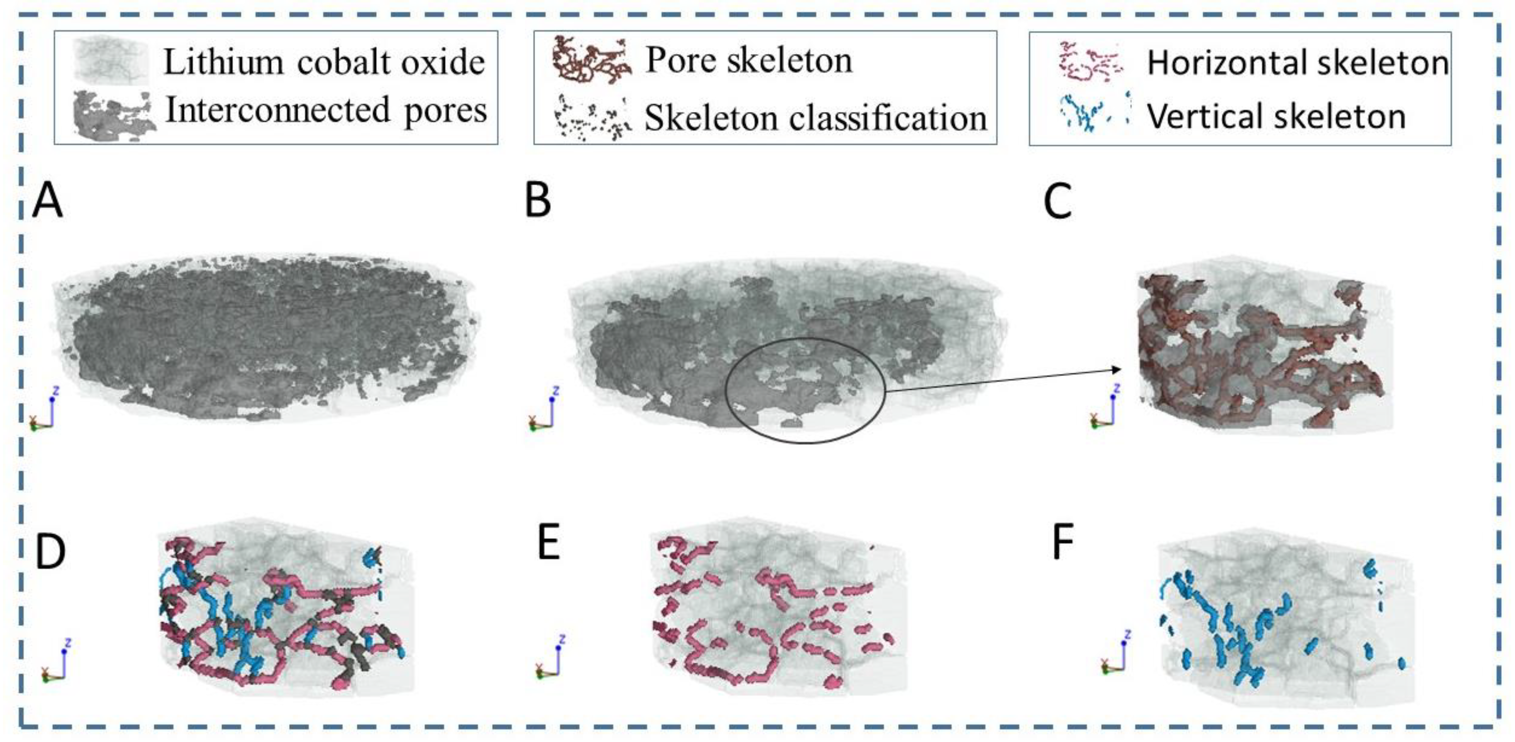 Extraction of interconnected pore structures: (A) lithium cobalt oxide and all pores; (B) lithium cobalt oxide with extracted interconnected pores; (C) pore skeleton; (D) pore skeleton classification; (E) horizontal skeleton; (F) vertical skeleton.